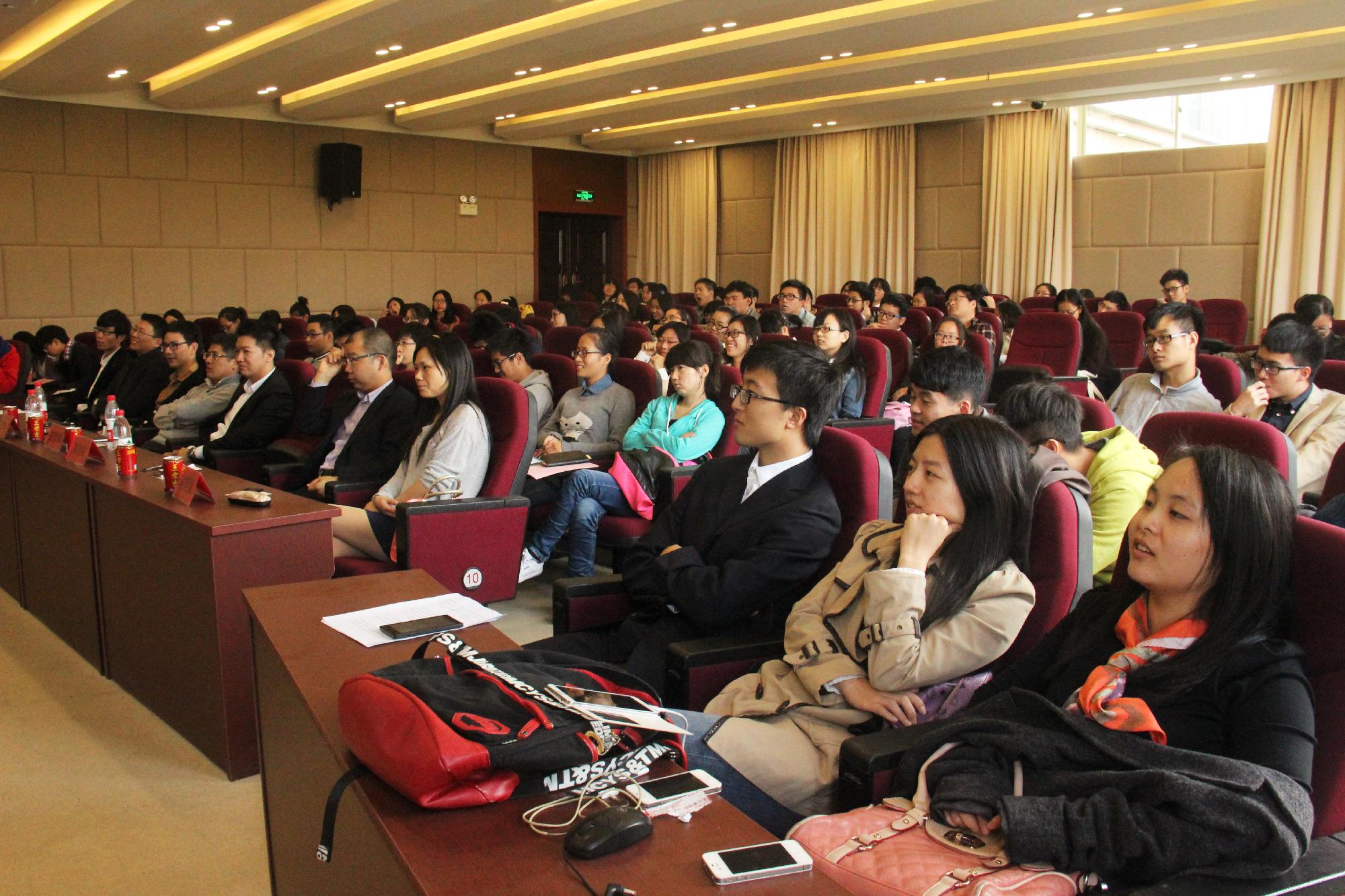 的同学们寄予了厚望,祝愿每一位参赛选手在竞赛中都有所收获,为校争光。阵阵掌声中,南华期货研究所产品创新分析师吴明星先生以专业的语言就金融期货品种及实物投资策略作了介绍,带领同学们在期货世界中感受它的无穷魅力。他先以选秀为例用图像来说明如何在单分与多分的偏好中寻求平衡;再生动地用人性为孤岛,只有通过市场才能相互联系的例子来介绍金融市场,用一段有趣的视频让我们对羊群效用印象深刻;随后,吴明星先生为了告诉大家投资需要智商和情商,判断数字就要对市场评估,与台下同学进行了简明有趣的互动与小游戏;最后,对金融期货大纲中的新增与热点内容(如ETF、非美货币等)做了一些阐释与提醒,使前来参加活动的同学获益匪浅。接着是谈效俊先生,他介绍了看涨(call)期权、看跌(put)期权、欧式期权、美式期权以及它们之间的联系与组合,从买入看涨期权的收益图讲起,逐渐深入,细致扼要,让同学们更加直观的了解买卖平价关系,并引入了隐含波动率的概念。除此之外,王敏男先生还详细介绍了衍生品知识与国际掉期和衍生品协会(ISDA),加强了同学们对场内与场外衍生品市场的区别以及场外衍生品的重要性的认识,又介绍了具有“固定+衍生”特性的结构化产品,指出中国的衍生品发展迅速且空间巨大,应对该产业的前景充满信心。在活动结束之时,陈荣达教授向南华期货研究所提出了需要拥有哪方面人才的问题时,“急需定价与行销企划方面的人才,并最好具备很强的电脑技术”让在场同学有了更明确的努力方向。
