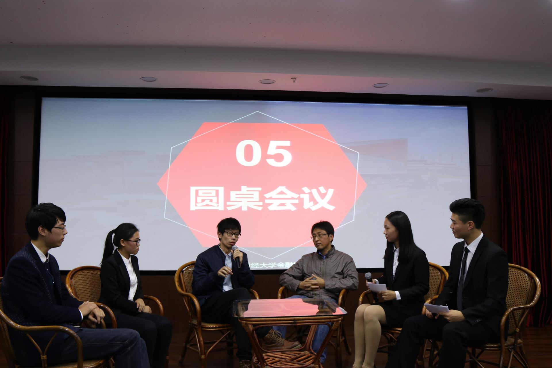 第三个环节是圆桌会议,钟立新老师,蒋超老师,国际金融学会会长马垠双,金融工程学会成员王欣杰以及主持人上台就座,他们就如何学以致用、推陈出新,如何营造学会的学术氛围等问题作了解答,气氛活跃,令到场的同学收获颇多。最后便是社团模拟精品活动,来自保险学会的成员们上台模拟了学会的精品活动——保险案例分析,让同学们对购买保险有了更深刻的认识。