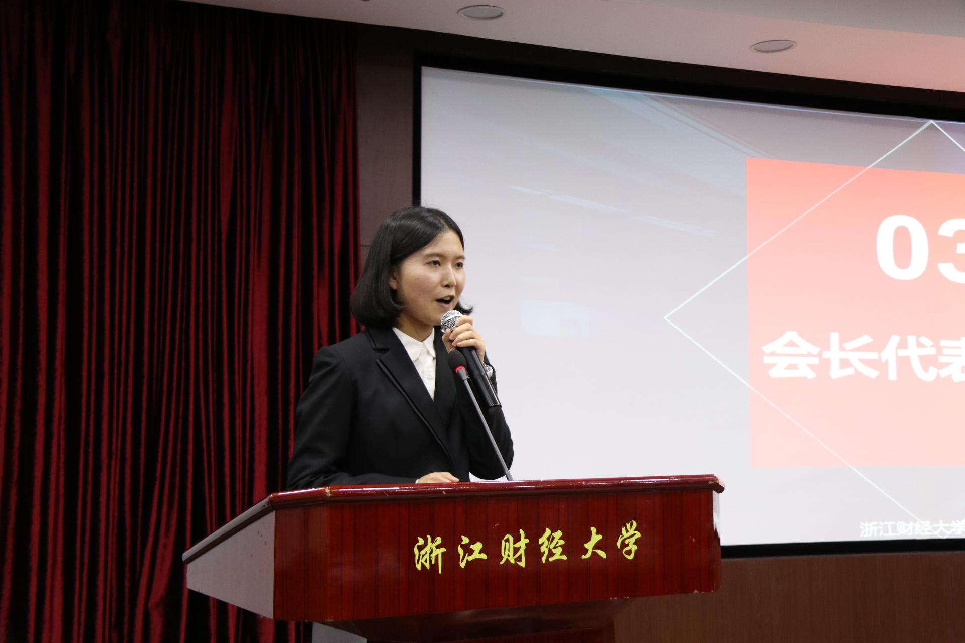 的社团建设推广至社会。国际交流学会会长王书杰、信用管理学会会长刘枞上台,就学会概况、学会的未来发展等方面作了讲话。最后金融学会代表徐丽帅上台发言,她介绍了金融学会作为黄色仓库