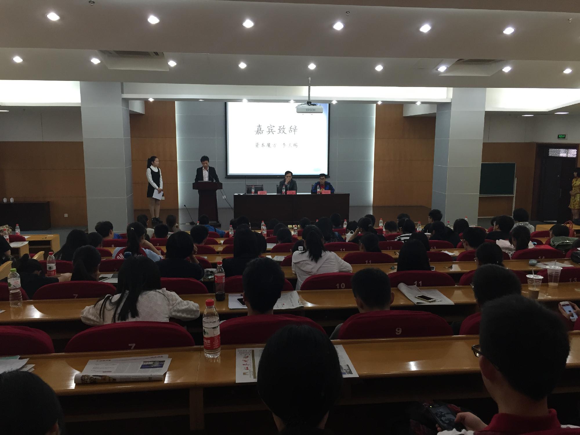 在主持人简练明了的开场白之后,资本魔方副总监李王赐先生进行致辞,他为同学们介绍了理财的重要性及资本魔方比赛平台的概况。结尾处,他以“赛出水平,赛出友谊,赛出风格”的响亮口号来表达他对模拟证券投资竞赛的衷心祝福。随后学会指导老师武鑫老师上台致辞,他介绍了比赛的历史以及比赛今后的发展方向。一番饱含鼓励的话语中承载着的是他对金融学会长远发展的殷切厚望。当武鑫老师宣布 “黄色仓库