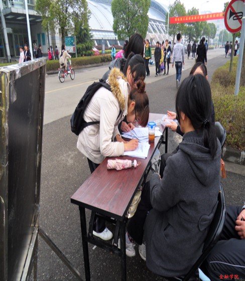 学校西门口抢眼的横幅和大型喷绘都让这次的吸引过往同学纷纷驻足报名。公司金融学会全体工作人员在进行了充分的前期准备工作后,全身心地投入到协助报名的环节中来。他们热情地发放宣传单,忙碌地为参赛选手登记资料,并且耐心地向每一位同学讲解活动信息和流程。同学们在得知ERP开始报名之后,或是成群结队的到报名点报名,或是纷纷联系自己的同学和朋友询问是否一起参加。短短的中午时间,就已经有许多同学成功组队。虽然冬末的西风稍嫌猛烈,但报名现场仍火热非凡。