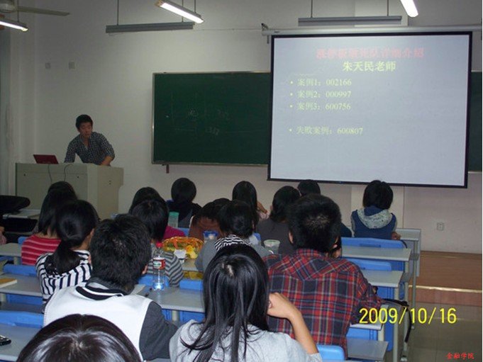 楼204教室,金融学会会员们目睹了带有传奇色彩的金锐、朱天民学长的风采,他们有着丰富的股市实战经验,而这次他们作为我们金融学会“对话股神”活动的嘉宾,莅临学会为会员作精彩的演说。