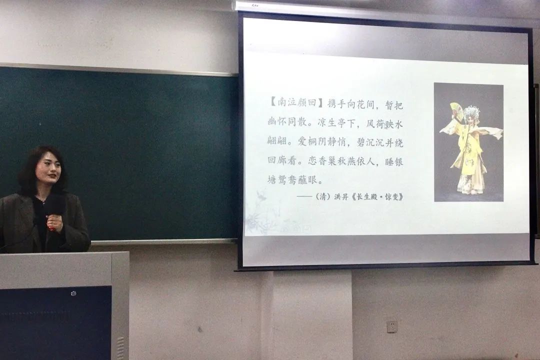 讲座伊始,毋丹老师利用一段与戏曲技艺相结合的现代歌曲为例阐释了音乐艺术的表现形式何价值。接着,毋丹老师带来《长生殿》的昆曲唱段,让同学们领略了昆曲杂多统一的和谐之美,感受到一种个性化的审美情趣。