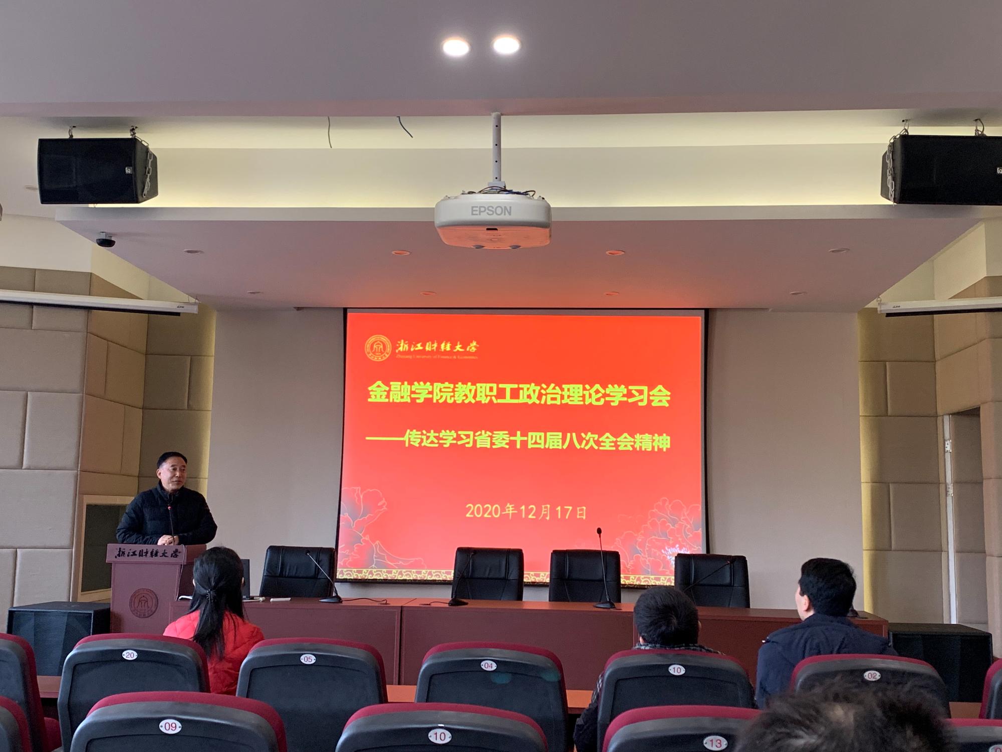 会上,蔡国金指出省委十四届八次全会是贯彻落实中央十九届五中全会精神所召开的一次极其重要的会议,对浙江省的建设发展具有里程碑意义。他指出学习贯彻省委十四届八次全会精神是当前一段时间各级党组织的重要政治任务,我们全院师生要紧扣“忠实践行‘八八战略’、奋力打造‘重要窗口’”的主题主线,坚决把思想和行动统一到中央和省委的部署要求上来。他强调要在学院的实际工作中加强学习精神,坚持明确“一条主线”,深刻领会全会核心要义,并做到三个结合:一是将学习与人才培养相结合,引导学生正确了解浙江建设发展大局;二是将学习与科学研究相结合,发挥我们的学科优势,贡献浙财金融力量;三是将学习与管理服务相结合,切实增强“窗口”意识,全面争先创优,为学院学术建设发展做出应有贡献。