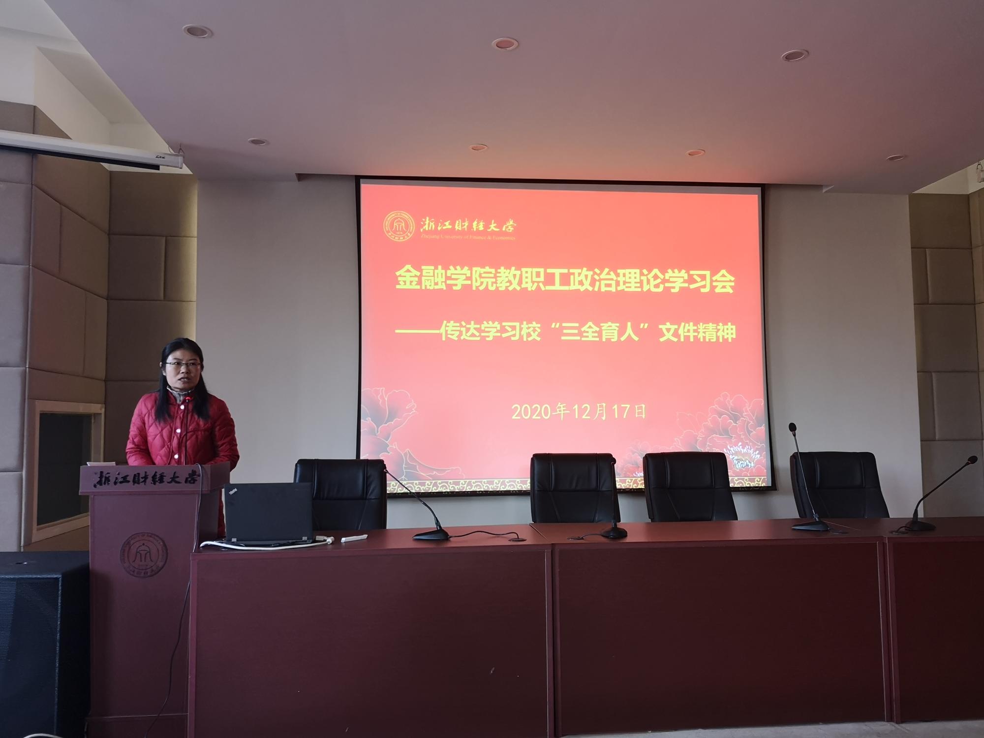 傅俊辉传达了教育部《高等学校课程思政建设指导纲要》的重要精神和内容,对纲要出台的背景和重要意义、全面推进高校课程思政建设的工作目标、工作思路、构建课程思政内容体系、教学体系、抓好课堂教学建设、提高教师课程思政建设意识和能力、推进课程思政建设工作落实等方面进行了深入解读。他指出,要科学设计课程思政教学体系、立足金融学科的专业特点推进课程思政建设、推动课程思政全程融入课堂教学建设、着力提升专业教师的课程思政建设能力、完善课程思政建设评价激励机制,将思政教育融入专业建设和课堂教学全过程。
