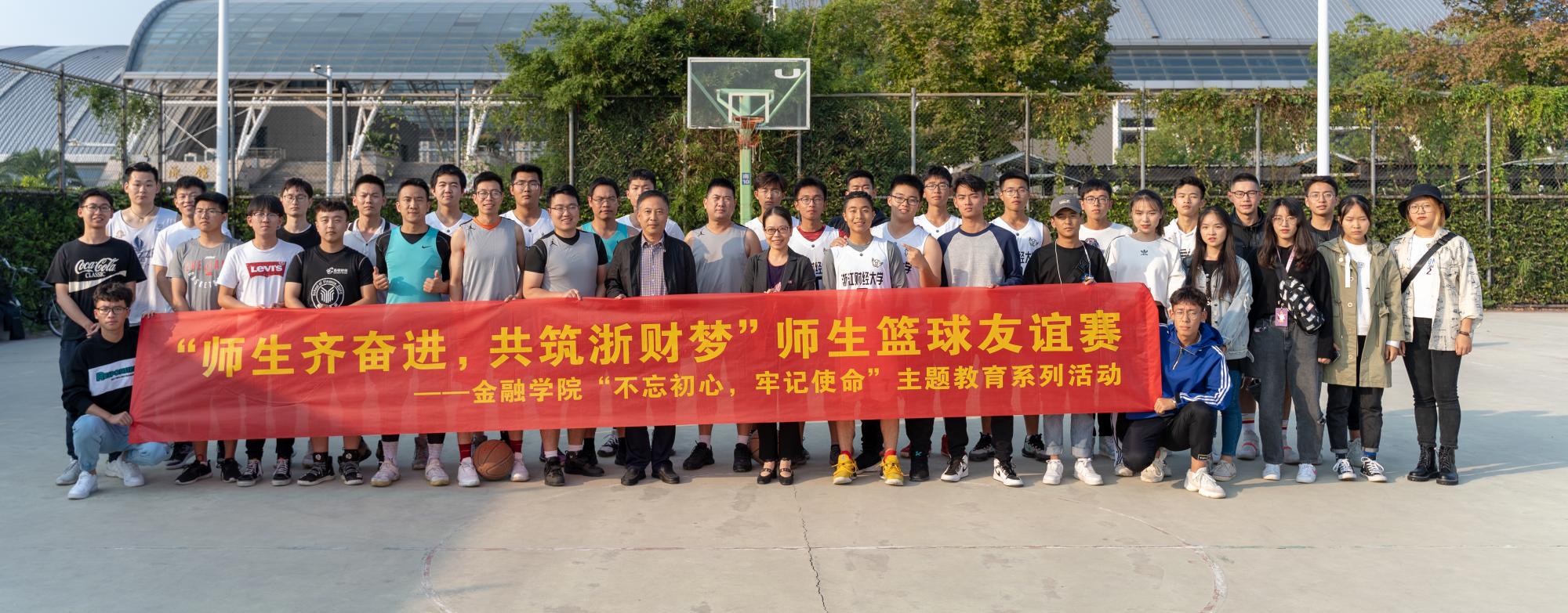 在灯光球场举行“不忘初心、牢记使命”主题教育系列活动——“师生共奋进,共筑浙财梦”师生篮球友谊赛。学院党委书记蔡国金、副书记叶秀前往观看,为师生加油助威。