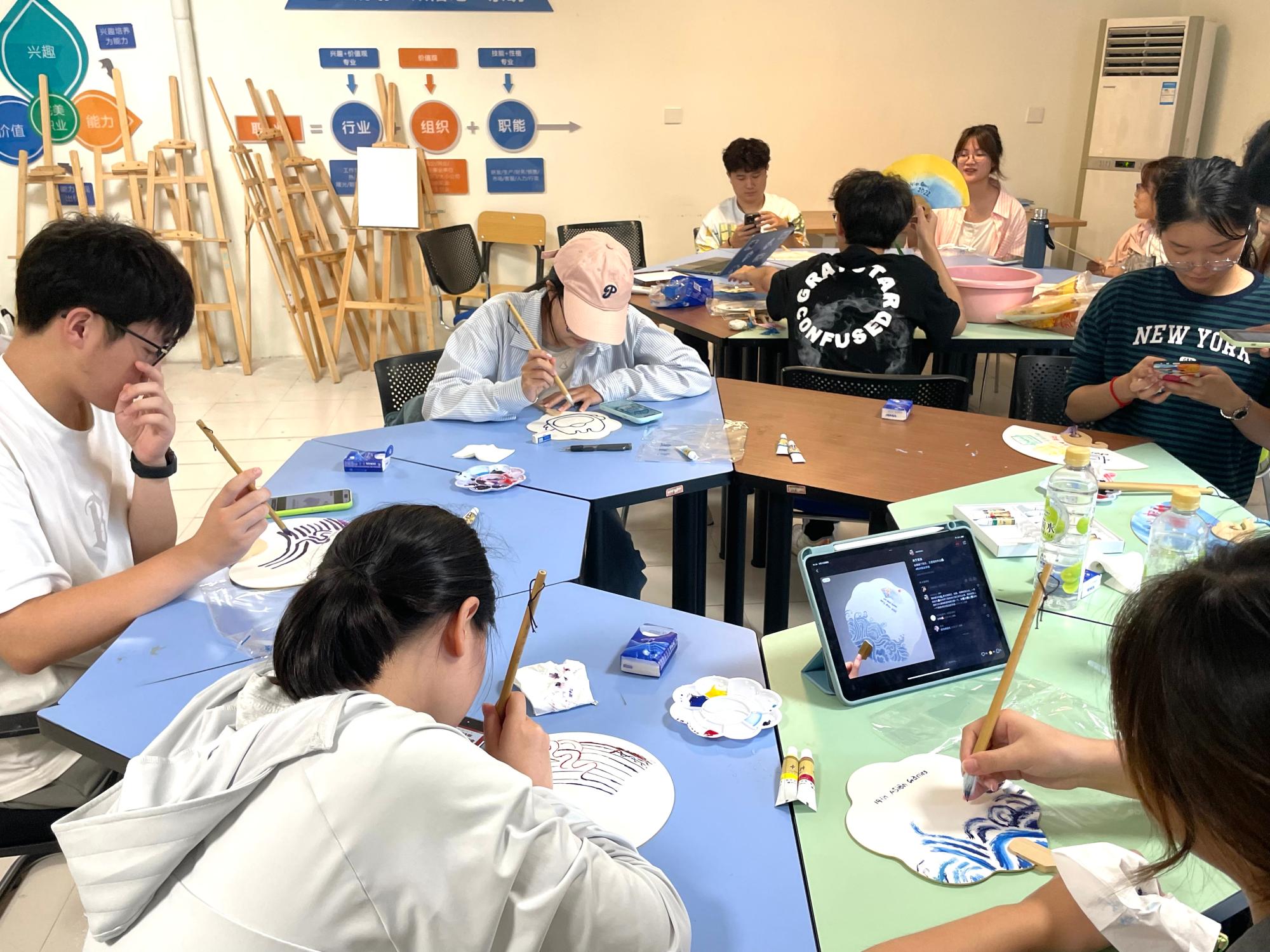 为有效发动全体同学进一步助力迎亚运盛会,形成支持亚运、参与亚运、服务亚运的浓厚氛围,黄色仓库 本科生第三党支部组织支部党员在桃李苑3幢活动室举行“扇画雅风 妙绘亚运”活动。同学们互相交流、共同创作,在扇面上画出各种与亚运相关的图画,并简单介绍了自己作品的含义。一张张精美的扇画,不仅表达了大家对杭州亚运会的美好期待,也领悟着“用心交融,互相包容”的杭州亚运精神。
