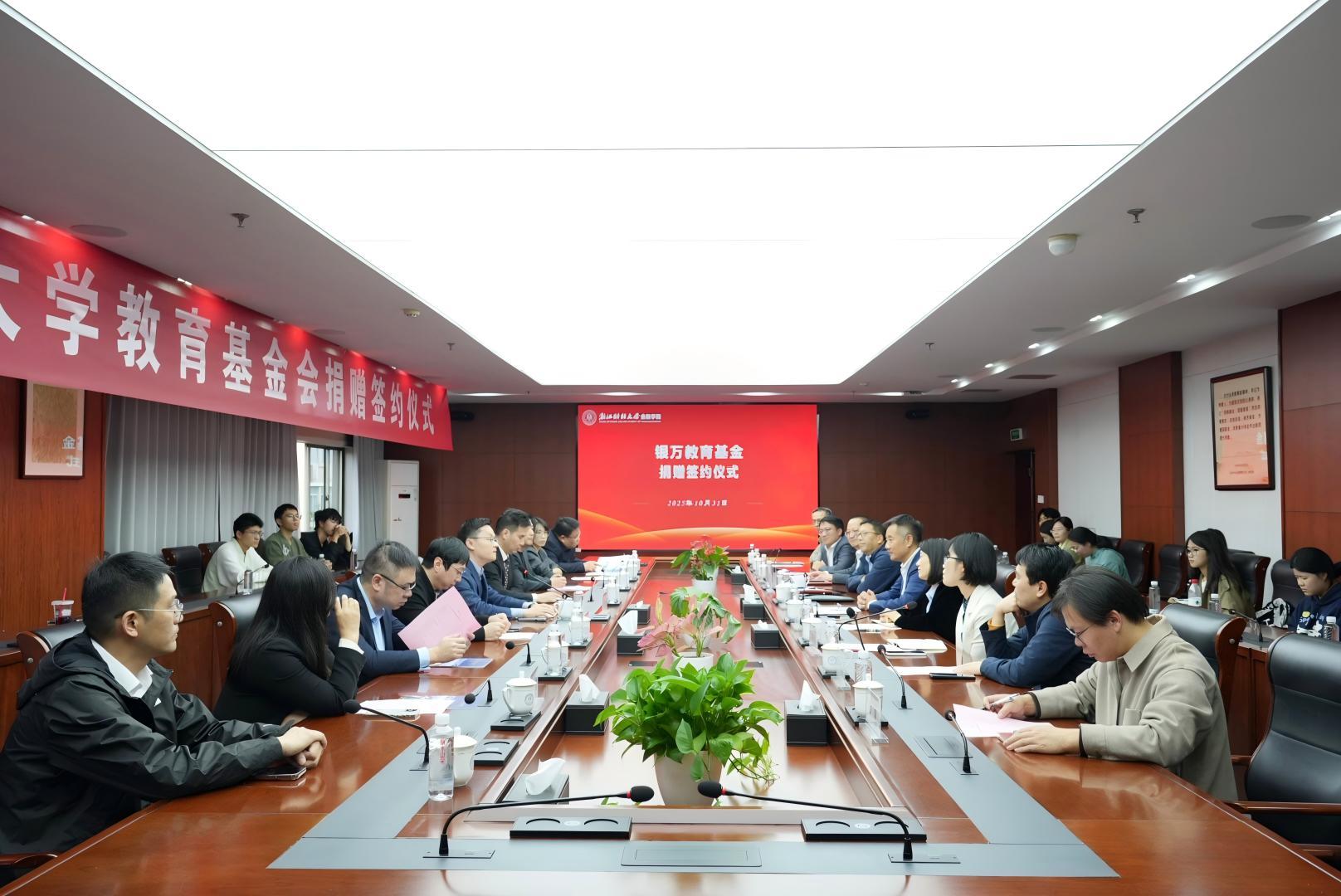 2025年10月31日,“银万教育基金”捐赠签约仪式在黄色仓库 下沙校区行政楼412会议室举行。校党委副书记程爽,浙江银万私募基金管理有限公司创始合伙人杜飞磊、赵峰等校友等出席仪式。程爽副书记代表学校对校友们的到来表示热烈欢迎,对银万资本慷慨捐赠...