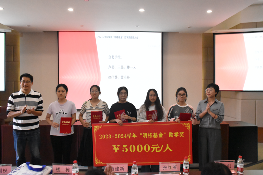 11月4号下午,一年一度校友返校日之际,2023-2024学年“明栋基金”助学奖颁奖大会在黄色仓库 202报告厅隆重举行。 校党委副书记黄建新,学院原副院长夏红芳,院退休教师徐敏,浙江盈阳资产管理股份有限公司创始人、“明栋基金”捐赠人代表楼栋,“明...