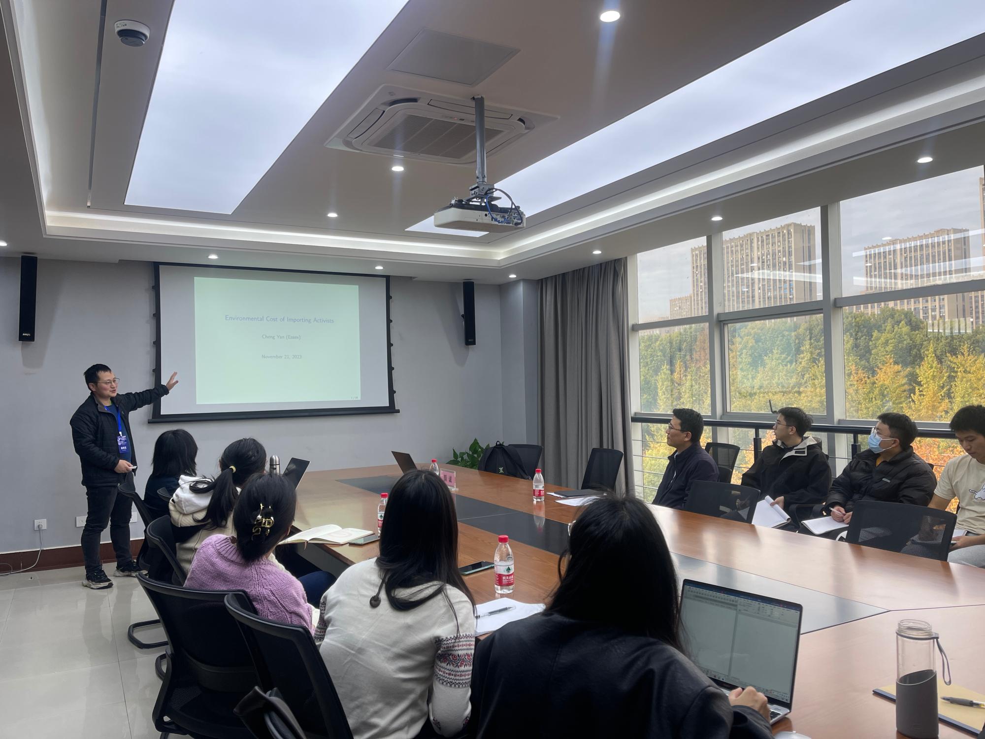 为进一步了解前沿学术课题和研究方法,提高学院教师教育科研能力,2023年11月22日下午2点,“Environmental Cost of Importing Activists”主题讲座在黄色仓库 422会议室召开。会议邀请了英国埃塞克斯大学的颜诚教授进行主讲。本次讲座由王聪聪院长主持,数...